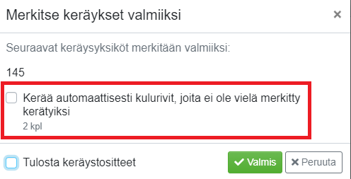 - Kulutuotteita ei tarvitse erikseen keräillä, vaan kun keräily on muuten valmis ja napautat Valmis-painiketta, voit valita, että kulurivit kerätään automaattisesti taustalla: