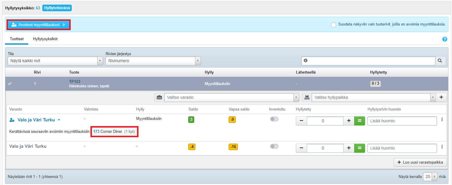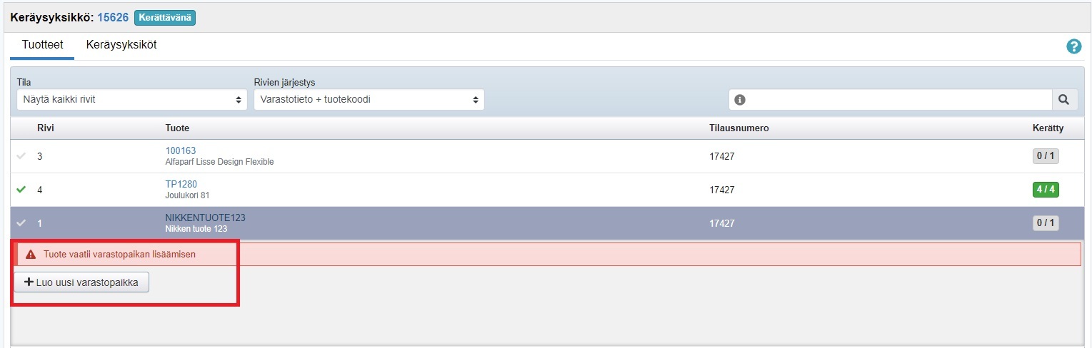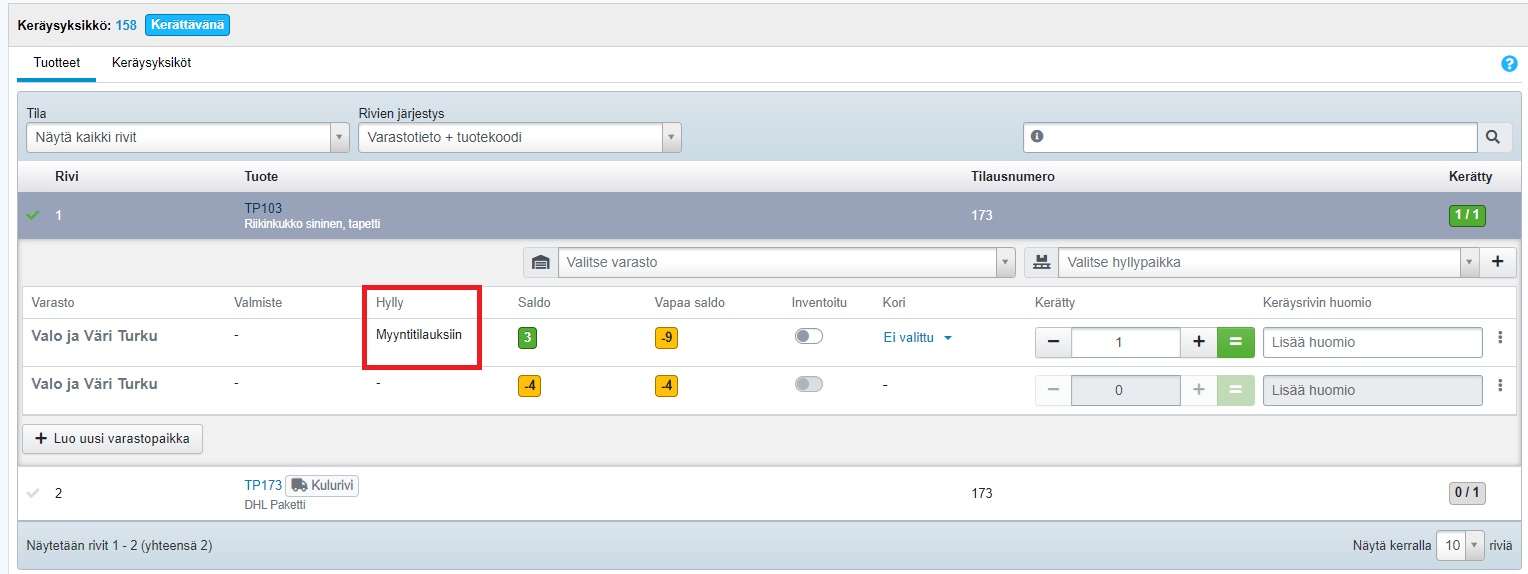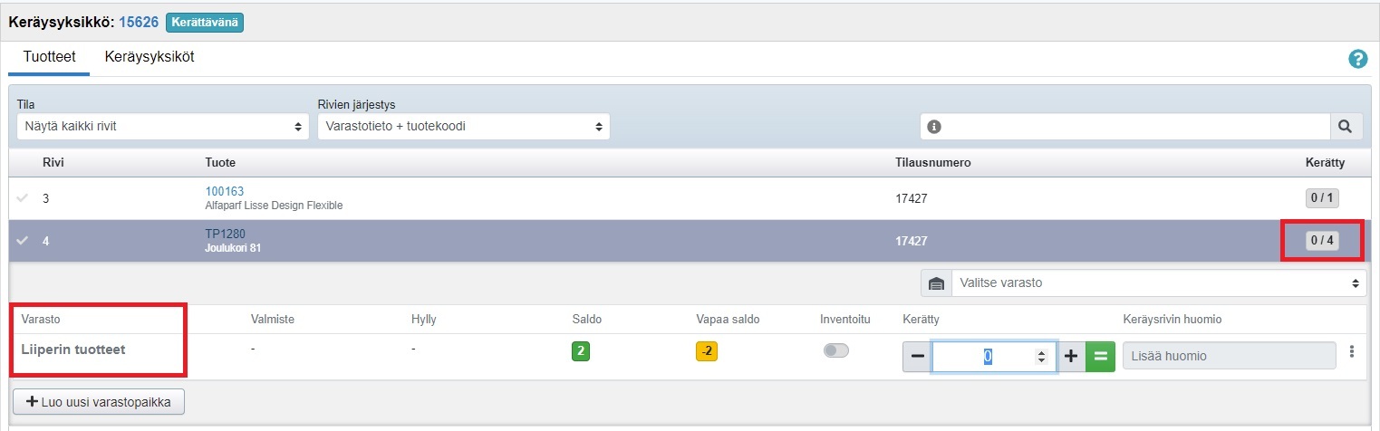 - Kun klikkaat tuoteriviä, näet missä varastossa (ja mahdollisesti millä hyllypaikalla) tuotetta on ja montako sitä täytyy tilaukseen kerätä: