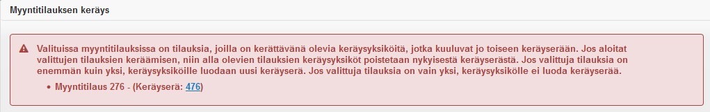Jos yrität ottaa keräykseen sellaisen myyntitilauksen, joka on jo mukana jossain keräyserässä, Tehden varoittaa sinua: