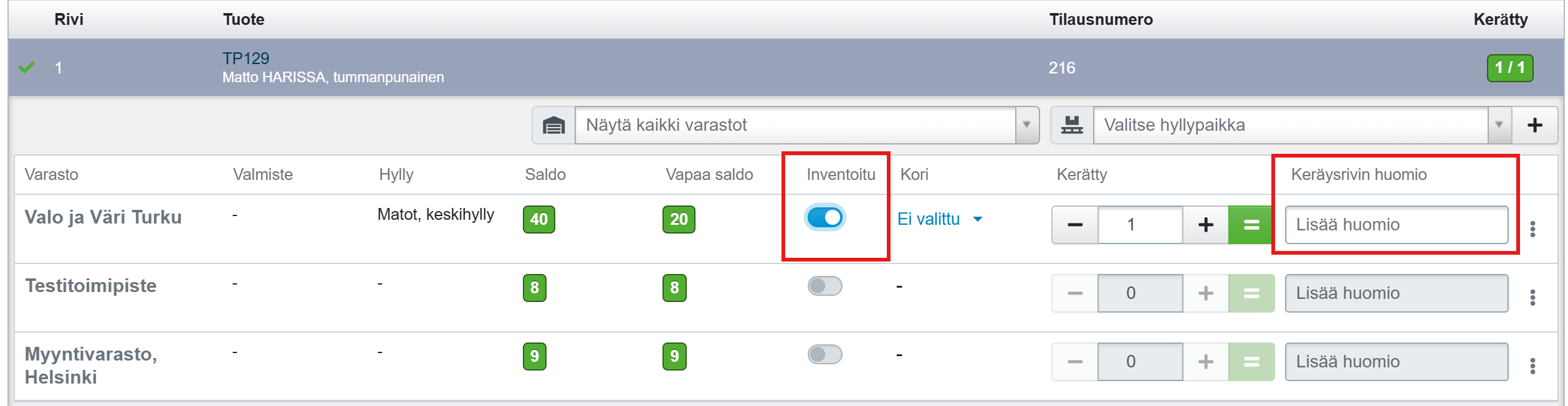 - Jos yrityksessäsi tehdään jatkuvaa inventointia ja tuotteen saldo todetaan Tehdenin ilmoittaman saldon mukaiseksi, keräysrivillä on mahdollista myös merkitä tuote inventoiduksi. Inventointikytkin aktivoituu, kun riviltä on merkitty kerätyksi ainakin yksi kappale tuotetta. Kun tuote merkitään inventoiduksi, sille tallennetaan uusi Inventoitu viimeksi -päivämäärä.