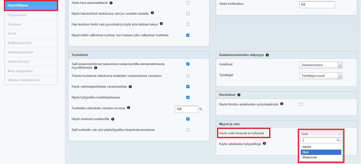 Jos haluat toteuttaa varastotoiminnot kannettavalla laitteella, kannattaa siirtyä käyttämään uutta keräilyä ja hyllytystä. Se onnistuu Yritysasetusten Käyttöliittymä-välilehdellä, Myynti ja osto -osiossa: