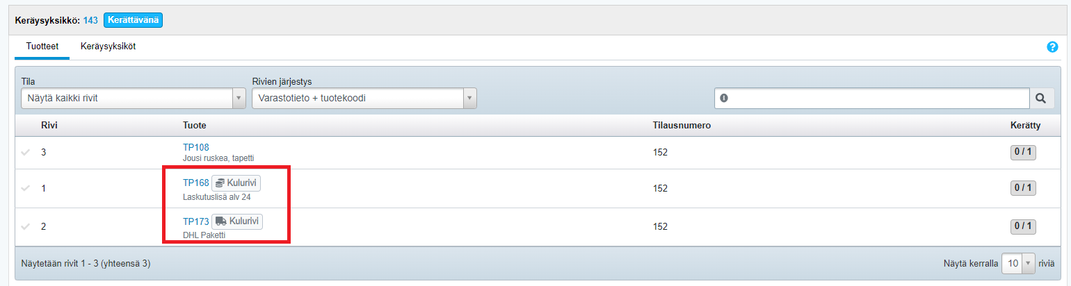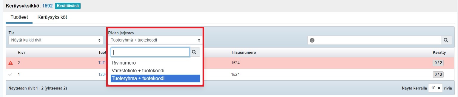 - Kun rivi on keräilty, siirryt automaattisesti seuraavaan tuoteriviin. Riviltä toiselle voi siirtyä myös riviä klikkaamalla.