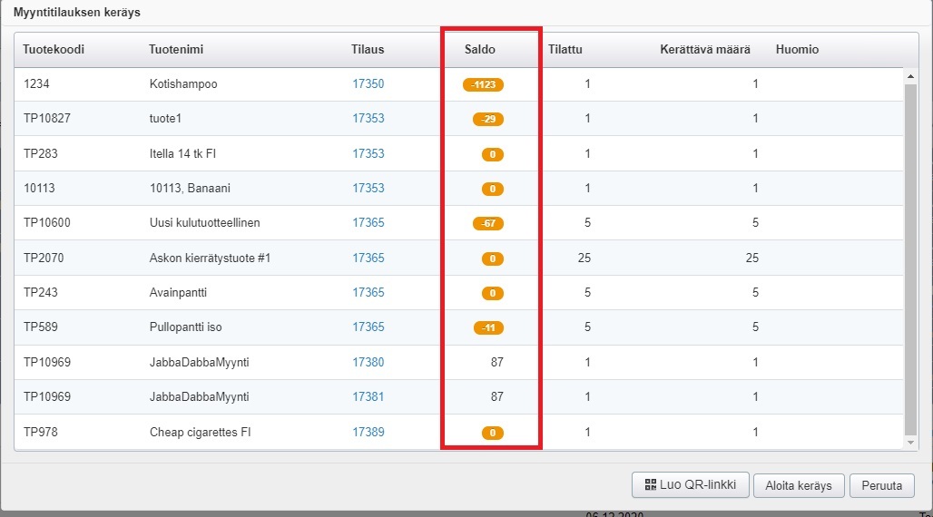 - Uudessa ikkunassa näkyvät kaikkien valittujen myyntitilausten kerättävät tuotteet lukumäärineen. Jos tietyn tuotteen saldo toimipisteen varastoissa on pienempi kuin kerättävä määrä, saldon taustaväri on oranssi: