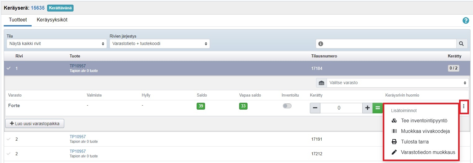 - Tarvittaessa pääset Lisätoiminnot-painikkeesta tekemään inventointipyynnön, muokkaamaan tuotteen viivakoodeja tai varastotietoja tai tulostamaan tuotetarroja. (Lue lisää kohdasta Keräilyn lisätoiminnot)