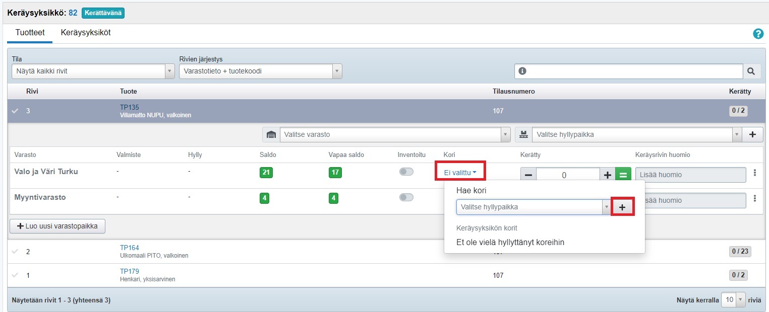 - Luo ensin avatussa keräilyssä väliaikainen hyllypaikka: klikkaa oikean varaston kohdalla Kori-sarakkeen Ei valittu -tekstiä, jonka kautta pääset luomaan uuden korin eli väliaikaisen hyllypaikan: