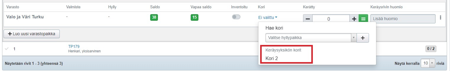 - Valitse kori ja merkitse Kerätty-kenttään koriin keräilemäsi määrä. Tehden siirtää sinut automaattisesti seuraavalle riville, jossa Kori-saraketta klikkaamalla pääset valitsemaan joko saman korin, johon edellinen tuote kerättiin, tai tarvittaessa toisen korin: