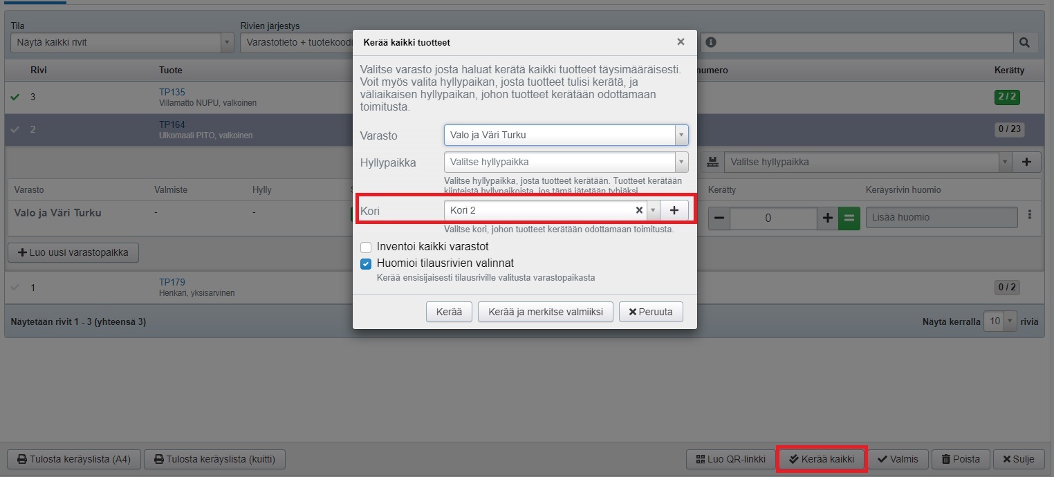 - HUOM! Jos tiedät varmasti, että kaikkia tuotteita löytyy varastosta riittävästi ja ne ovat oikeilla hyllypaikoillaan JA kaikki tilauksen tuotteet kerätään samaan koriin, rivejä ei tarvitse käydä läpi yksi kerrallaan, vaan voit valita rivien alareunasta Kerää kaikki -painikkeen ja valita tai luoda tätä kautta väliaikaisen hyllypaikan: