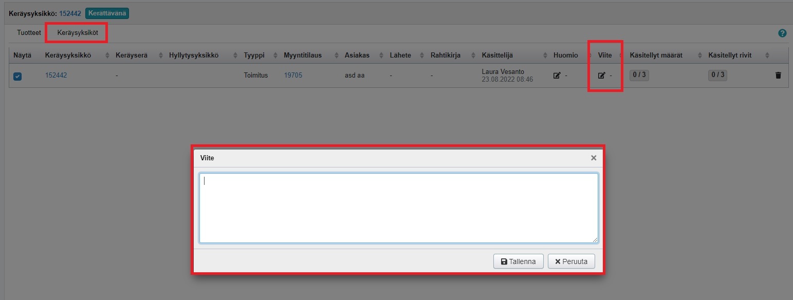 - Jos haluat lisätä keräysyksikölle viitteen, se onnistuu keräysyksikön tiedoissa, Viite-sarakkeen muokkauskuvaketta klikkaamalla. Viitteen voi lisätä myös jälkikäteen Keräysyksiköt-ohjelmassa. Tallennettu viite näkyy Nettohinnat A4 -lähetteellä, ja jos samassa lähetyksessä on useita keräysyksiköitä, kaikille lisätyt viitteet näkyvät Nettohinnat A4 -lähetteellä.