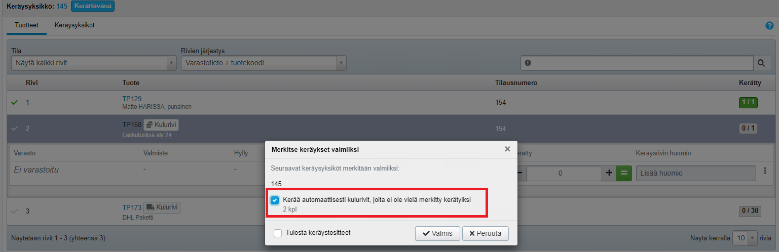 - Kulutuotteita ei tarvitse erikseen keräillä, vaan kun keräily on muuten valmis ja klikkaat Valmis-painiketta, voit valita, että kulurivit kerätään automaattisesti taustalla: