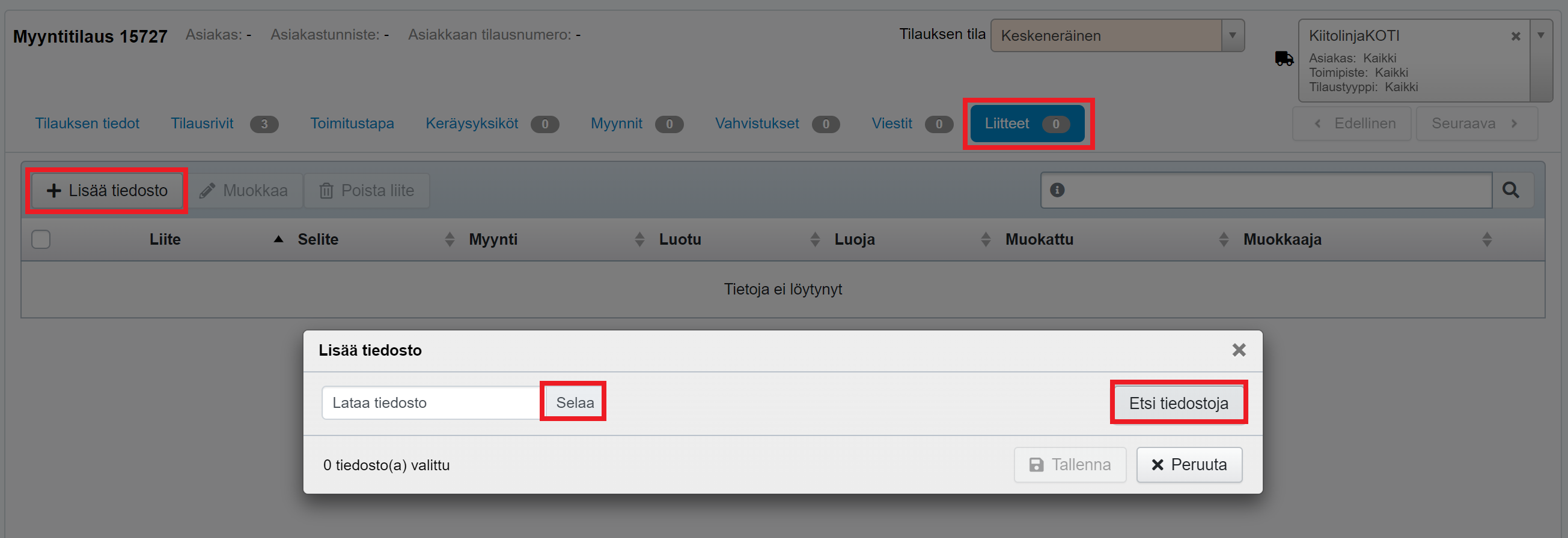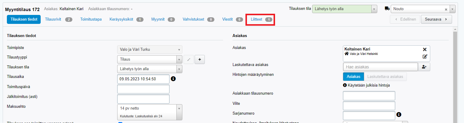 Myyntitilauksen liitteet löytyvät myyntitilaukselta omalta välilehdeltään: