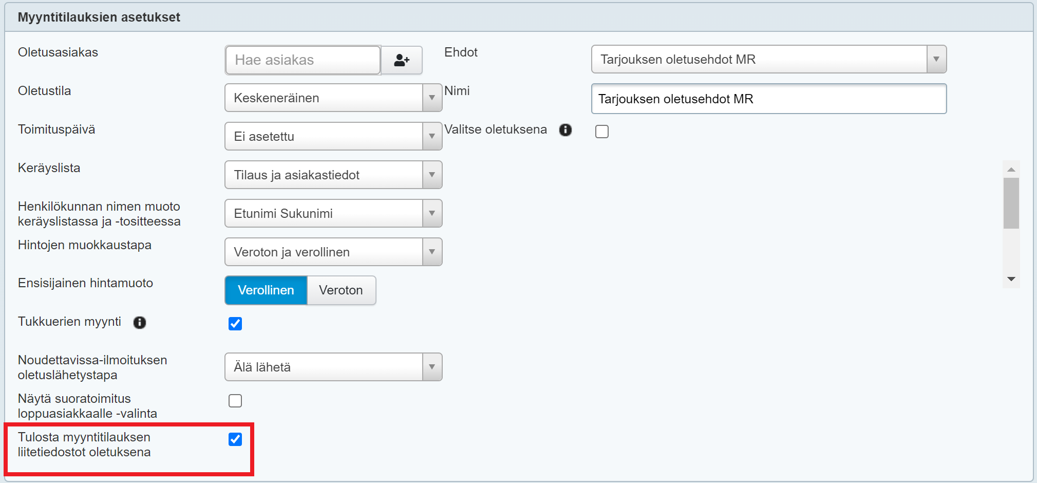 Myyntitilauksen liitteiden tulostus oletuksena