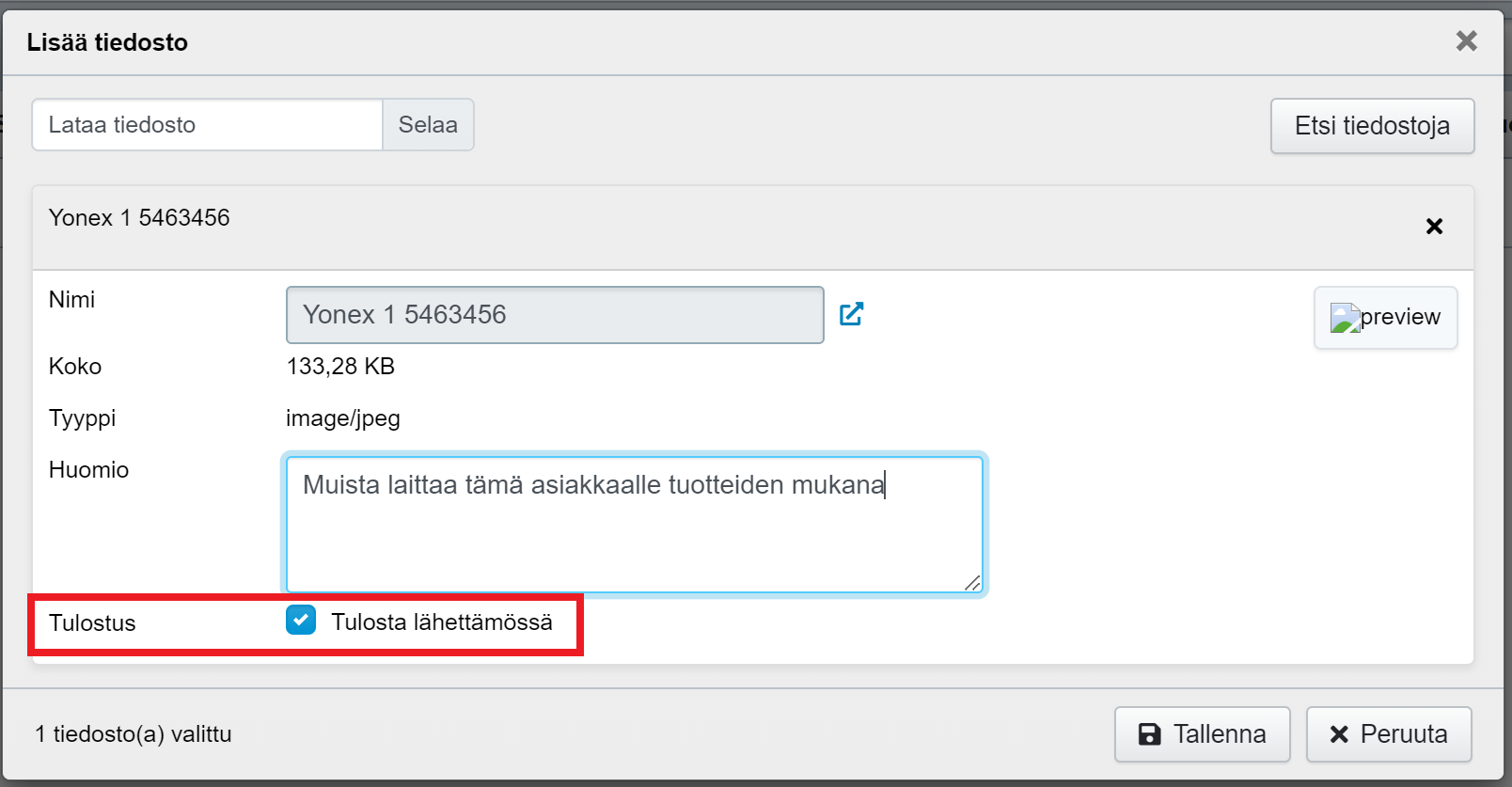 - Jos liitetiedosto on tarkoitus toimittaa asiakkaalle, valitse lisäyksen yhteydessä Tulosta lähettämössä -kohdan. Näin liite tulostetaan automaattisesti rahtikirjan jne. lähetysasiakirjojen yhteydessä. Huom! Kaikkia tiedostotyyppejä ei voida tulostaa, eli esim. xls-tiedostojen kohdalla tulostusvalintaa ei näytetä.