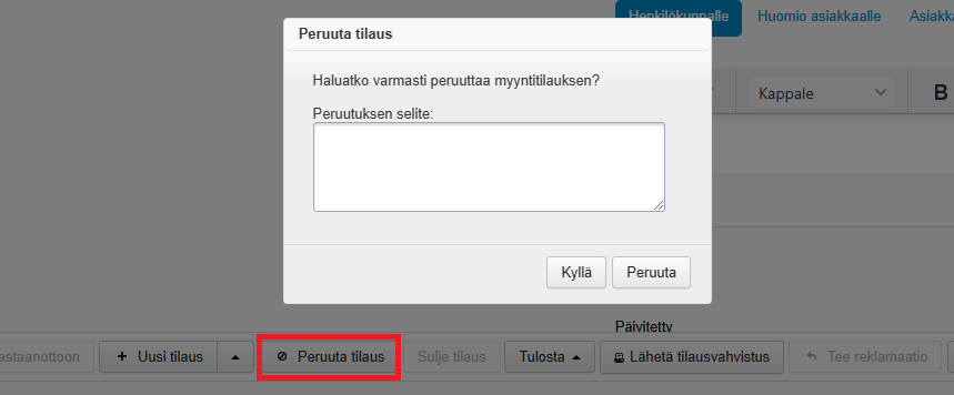- Kun myyntitilaukseen ei enää liity aktiivisia myyntejä tai keräilyjä, voidaan tilaus perua alalaidan Peruuta tilaus -painikkeesta. Peruttu tilaus löytyy perumisen jälkeen edelleen Tehdenistä Peruttu-tilassa. Voit tarvittaessa antaa peruutukselle selitteen: