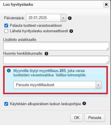 - Jos myyntitilaukselle on jo tehty myyntejä, tee niistä virhekuitti tai hyvityslasku. Tehden ehdottaa jo vastakirjauksen teon yhteydessä myyntiin liittyvän myyntitilauksen peruuttamista, ja voit valita peruuttamisen jo tässä kohdassa. Esimerkki hyvityslaskun luonnista: