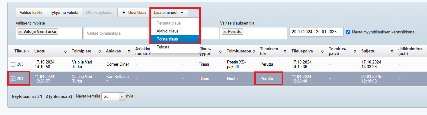 Myyntitilauksen voi myös poistaa kokonaan Tehdenistä. Näin kannattaa tehdä vain, jos tilaus oli esim. testi tai muu sellainen tilaus, jonka tietoihin ei ole tarvetta palata. Valitse myyntitilauslistauksesta peruttu tilaus ja Lisätoiminnot-painikkeen takaa Poista tilaus: