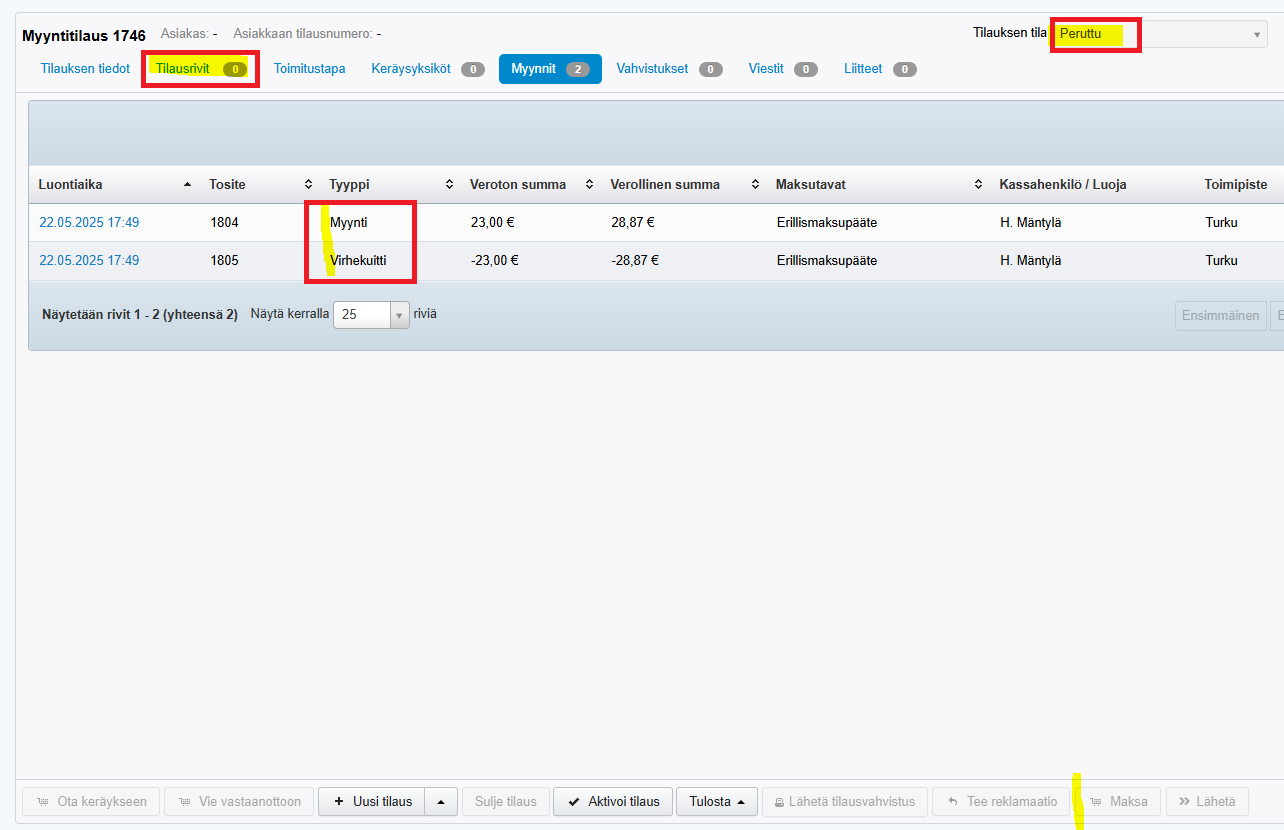 - Myyntitilaus on edelleen mahdollista aktivoida Aktivoi tilaus -painikkeesta, jolloin tilausrivit palautuvat tilaukselle ja tilauksen voi esim. viedä kassalle maksettavaksi Maksa-painikkeesta.