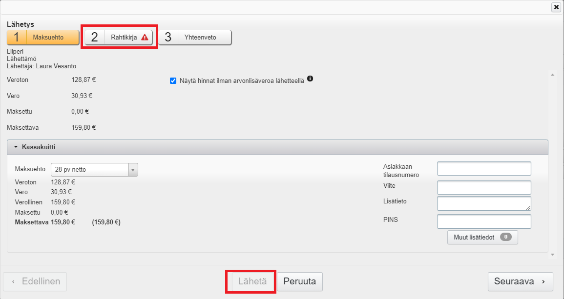 - Avautuvassa lähetysikkunassa voit joko käydä Maksuehto-, Rahtikirja- ja Yhteenveto-sivut yksi kerrallaan läpi ja tehdä tarvittavat muutokset, tai jos tiedät, että tiedot pitävät paikkansa, klikata heti Lähetä-painiketta.