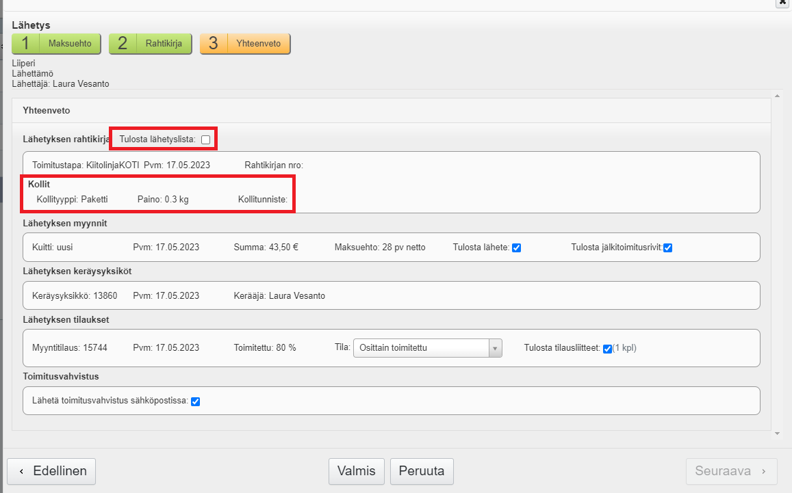 - Tarkista rahtikirjan tiedot ja vaihda tarvittaessa toimitustapa.