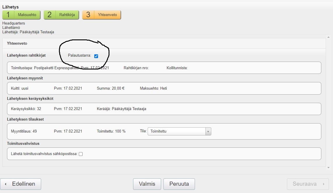 - Jos yrityksessäsi on käytössä Unifaun-integraatio ja olet ottanut Kuljetuspalvelut-sivulla käyttöön palautustarran tulostamisen, voit valita Palautustarra-kohdan:
