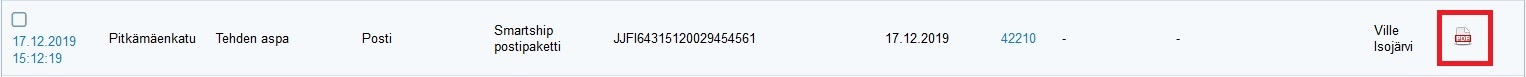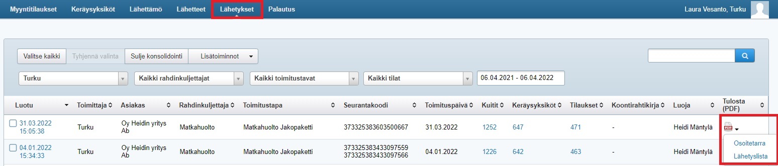 Jos haluat aina tulostaa lähetyslistan, valitse oletustulostus Yritysasetusten Myynnin asetukset -välilehdellä. Lähetyslistan tuoteriveillä on tieto siitä, mihin tilaukseen ja lähetteeseen rivi liittyy. Lähetyslistan voi tulostaa myös myöhemmin Myynti-ohjelman Lähetykset-osion Tulosta-sarakkeen pdf-kuvakkeesta klikkaamalla. Jos yritykselläsi on käytössä kuljetuspalveluintegraatio, samasta paikasta tulostetaan myös osoitetarrat: