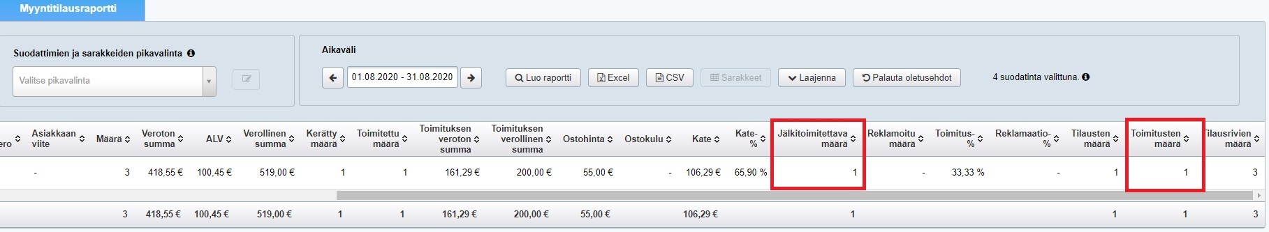 - Näin näet raportilla ne tilaukset, joilla on jälkitoimituksessa olevia tuotteita. Huom! Jos tuotetta on varastossa, sitä ei lasketa jälkitoimitettavaksi, vaikka tilausta ei olisikaan vielä toimitettu. Raportti näyttää siis vain ne jälkitoimitettavat tuotteet, joita ei ole tällä hetkellä varastossa.