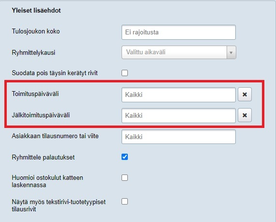Aikaväli-suodatin hakee myyntitilauksia niiden luontipäivän mukaan, mutta tuloksia voi rajata lisäksi sen mukaan, millä aikavälillä niiden toimitus- tai jälkitoimituspäivä on. Tämä tapahtuu Yleiset lisäehdot -osiossa: