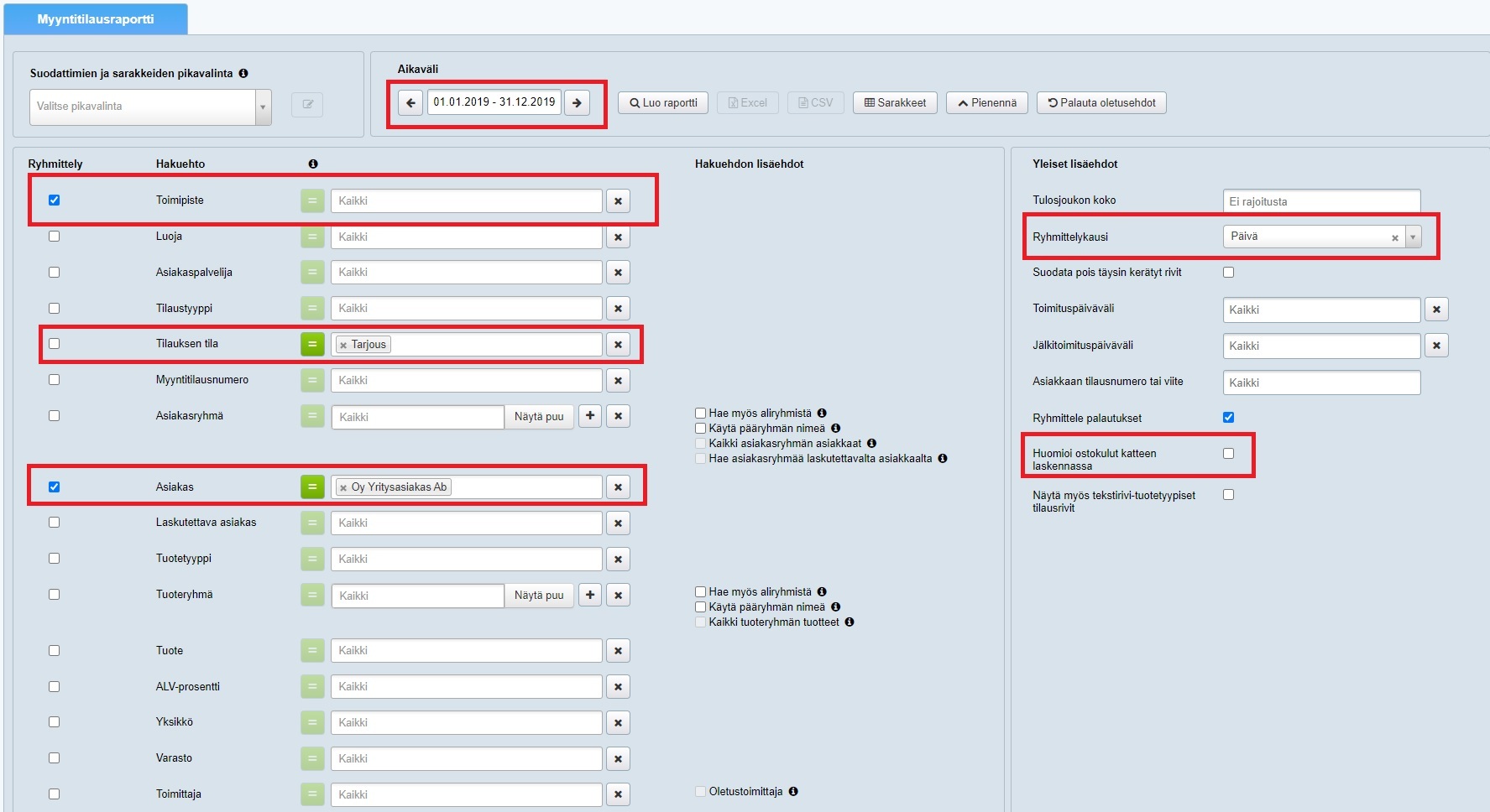 - Valitse haluamasi aikaväli ja ryhmittele tulosjoukko esim. toimipisteen tai tilauksen mukaan.