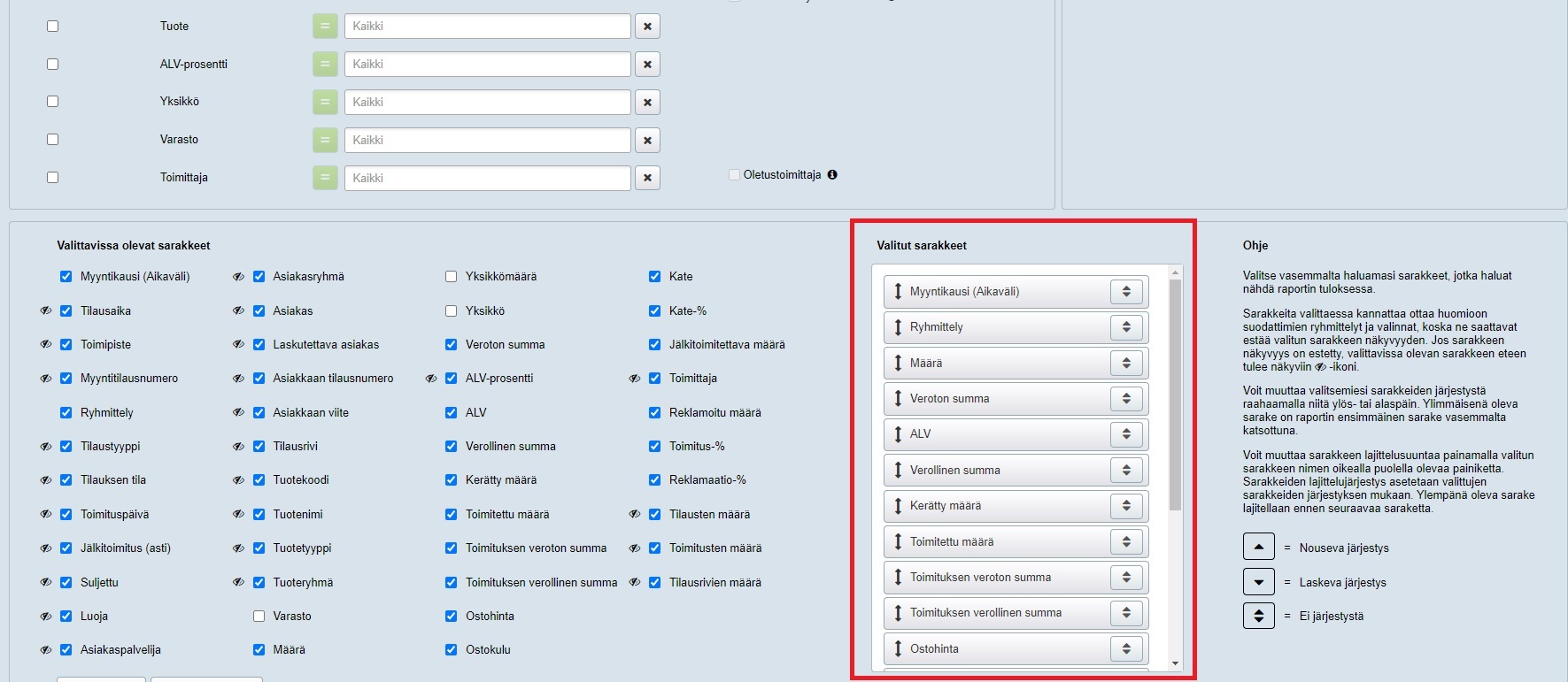 ). Näin rahtikuluja ei oteta mukaan myyntitilausraportin tuloksiin: