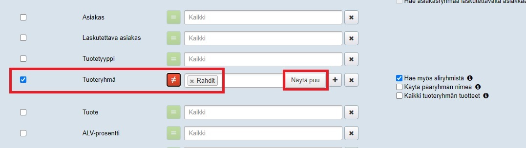 Jos yrityksesi rahtikulut on lisätty omaan tuoteryhmäänsä, ne on helppo poistaa myyntitilausraportilta: riittää, kun haet Tuoteryhmä-suodattimen tuoteryhmäpuusta rahtien tuoteryhmän ja klikkaat sitten vihreää yhtäläisyysmerkkiä (