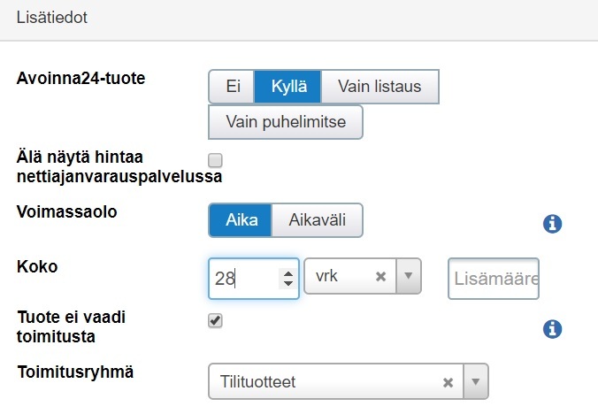 - Luo Tuotteet-ohjelmassa uusi tilituote ja määrittele sille Lisätiedot-kentässä voimassaoloajaksi 28 päivää: