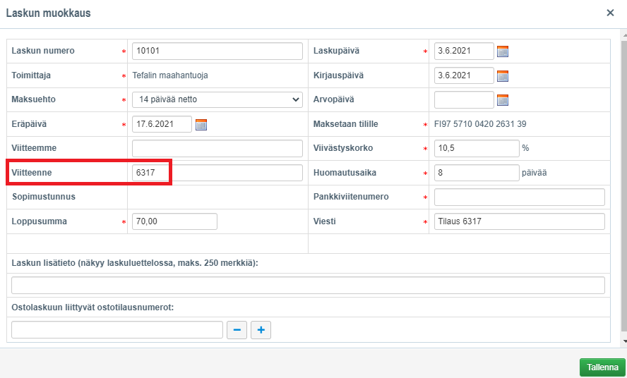 Jos ostolasku kohdentuu useisiin ostotilauksiin, annetaan tilausviitteeksi pilkuilla eroteltu lista Tehdenin ostotilausten numeroista. Yleensä toimittaja viittaa ostolaskun tiedoissa alkuperäisen ostotilauksen numeroon ja sen näkee ostolaskusta.