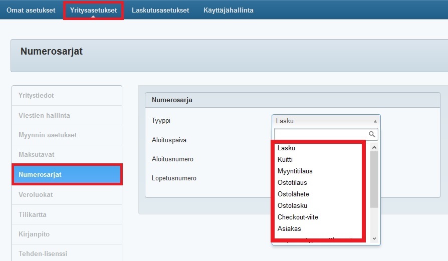 Kaikille Tehdeniin luotaville laskuille, kuiteille, tositteille, tilauksille, asiakkaille, tilityksille ja erilaisille varastoyksiköille syntyy automaattisesti numero, jonka perusteella niitä voi esim. seurata kirjanpidossa ja etsiä Tehdenissä. Oletuksena numerointi alkaa 1:stä (laskujen numerointi 1000:sta), mutta Yritysasetusten Numerosarjat-välilehdellä voit tositekohtaisesti määritellä, millaista numerosarjaa noudatetaan.
