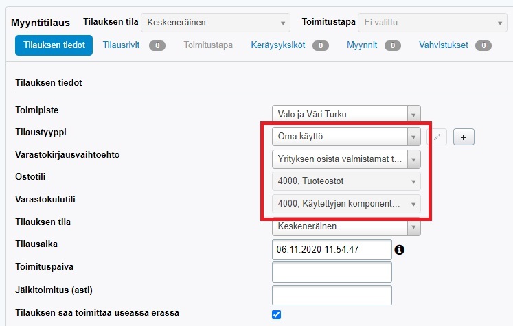 - Valitse oikea varastokirjausvaihtoehto. Jos olet luonut tätä tarkoitusta varten uuden varastokirjausvaihtoehdon, ostotili ja varastokulutili ovat oikein. Tärkeintä on, että myyntitilauksella tapahtuu vain varastokirjauksia eli osto- ja varastokulutilillä on sama numero.