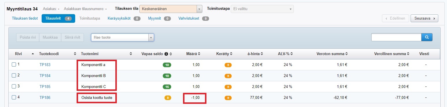 - Siirry Tilausrivit-välilehdelle ja lisää myyntitilaukselle kaikki ne komponentit, joita tuotteen valmistamiseen tarvitaan. Lisää myyntitilaukselle myös komponenteista koottu valmis tuote ja sen määrä negatiivisena, eli lisää miinusmerkki kappalemäärän eteen: