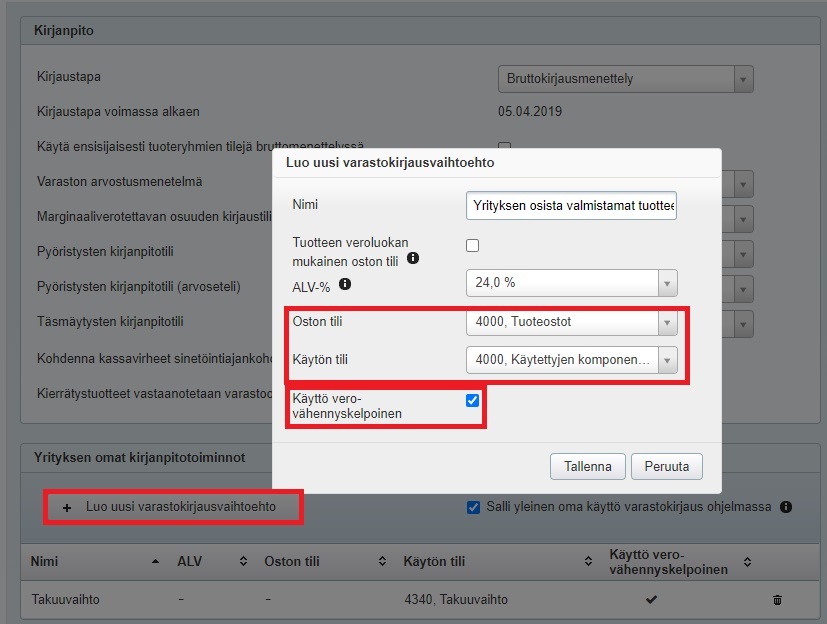 - Yritysasetusten Kirjanpito-välilehden Yrityksen omat kirjanpitotoiminnot -osiossa on luotu uusi varastokirjausvaihtoehto. Varastokirjausvaihtoehdolle kannattaa antaa nimeksi esimerkiksi Yritys X:n itse valmistamat tuotteet tms. nimi, josta sen erottaa helposti muista. (tarkemmat ohjeet: Varastokirjauksen luominen). Muista valita kohta Käyttö verovähennyskelpoinen: