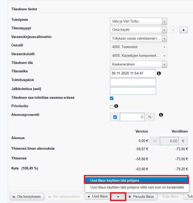 Kun edelliset kohdat on tarkistettu, luo myyntitilaus näillä ohjeilla: