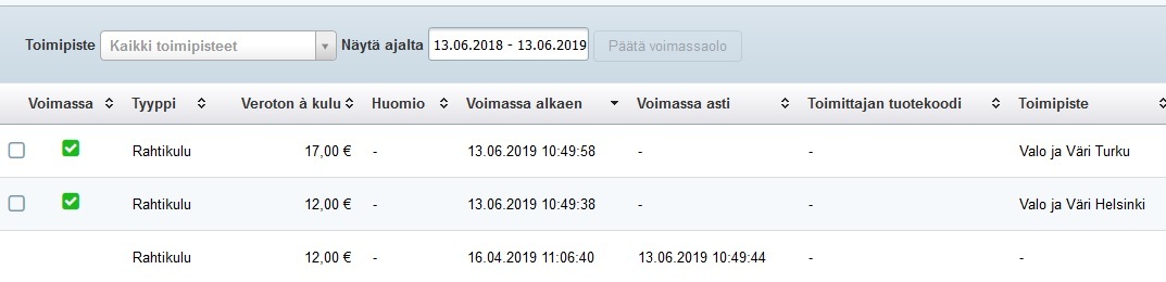 - Samaa myyntituotetta voidaan tilata useilta eri toimittajilta ja eri toimipisteisiin, joten tuotteella voi kuitenkin olla samanaikaisesti voimassa eri toimittajan tuotteille ja eri toimipisteille määriteltyjä ostokuluja. Ostokulut-välilehdellä näytetään sekä voimassa olevat (