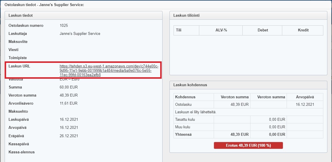 - Jos haluat verrata asiakkaan alkuperäistä ostolaskua ja laskun rivitietoja Tehdenin läheteriveihin, voit avata alkuperäisen ostolaskun pdf-muodossa uuteen välilehteen Laskun URL -kentän linkkiä klikkaamalla. Pdf-lasku aukeaa, vaikka et olisi kirjautuneena Procountoriin: