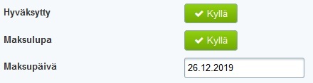 - Varmista, että Hyväksytty- ja Maksulupa-kentissä on Kyllä-valinta, ja lisää Maksupäivä-kenttään laskun alkuperäinen eräpäivä: