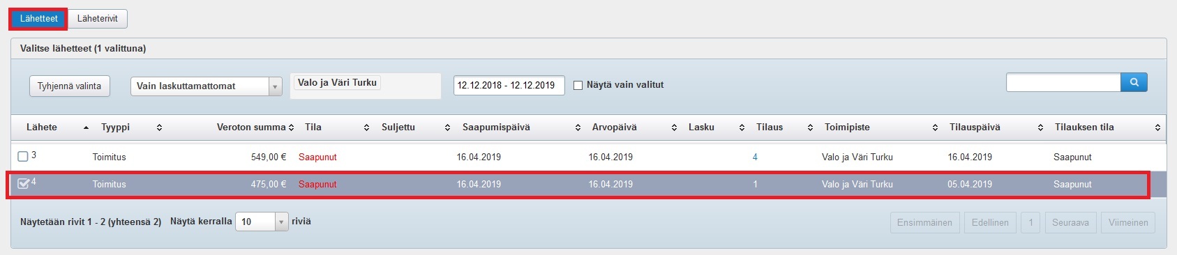 - Valitse Lähetteistä se ostotilaus, joka ostolaskuun liittyy.