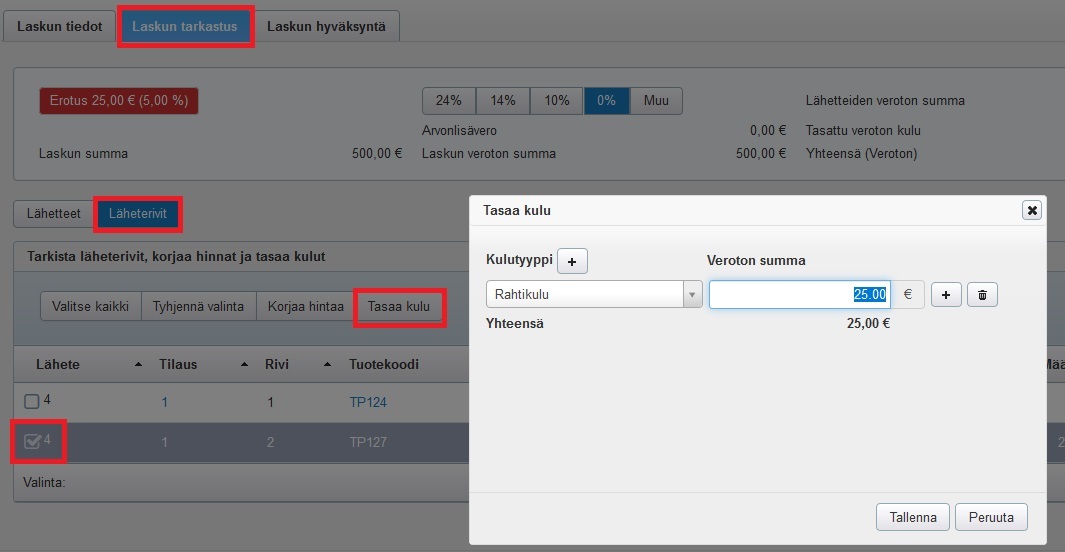- Jos summa ei täsmää ja haluat esimerkiksi lisätä ostotilaukseen rahdin osuuden, siirry Läheterivit-näkymään, valitse joku läheterivi ja klikkaa Tasaa kulu -painiketta: