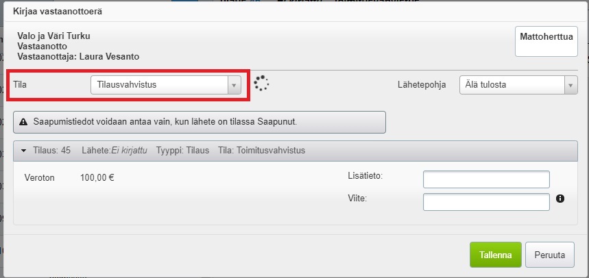 - Avautuvassa ikkunassa valitse Tila-valikosta Tilausvahvistus: