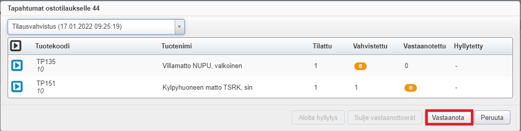 - Jos olet kirjannut ostotilauksesta tilausvahvistuksen, näet Tapahtumat ostotilaukselle -ikkunan, jossa klikkaat Vastaanota-painiketta: