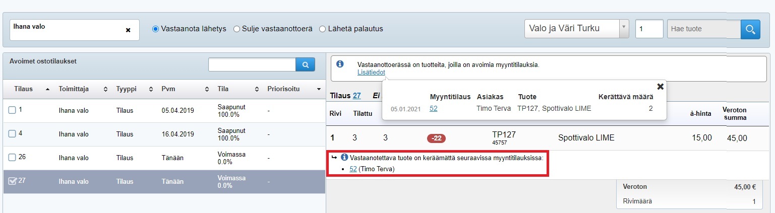 - Jos vastaanotettavassa erässä on tuotteita, joita odotetaan avoimilla myyntitilauksilla, näet myyntitilauksen tiedot sekä asiakkaan nimen: