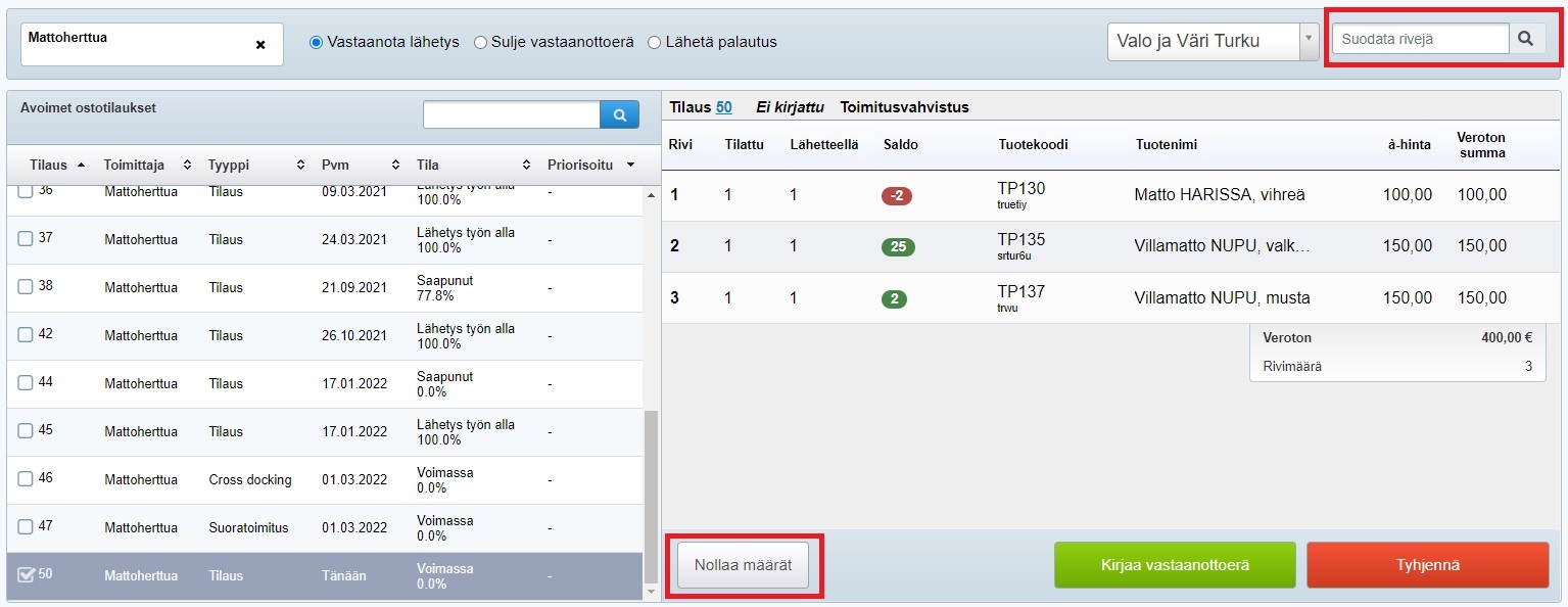 Joskus yritys voi tehdä toimittajalle suuria, useiden satojen tuoterivien tilauksia, joista kuitenkin ensimmäisessä toimituksessa toimitetaan vain muutamia tuotteita. Tällaisessa tapauksessa voit korjata rivien määräksi nollan seuraavasti: