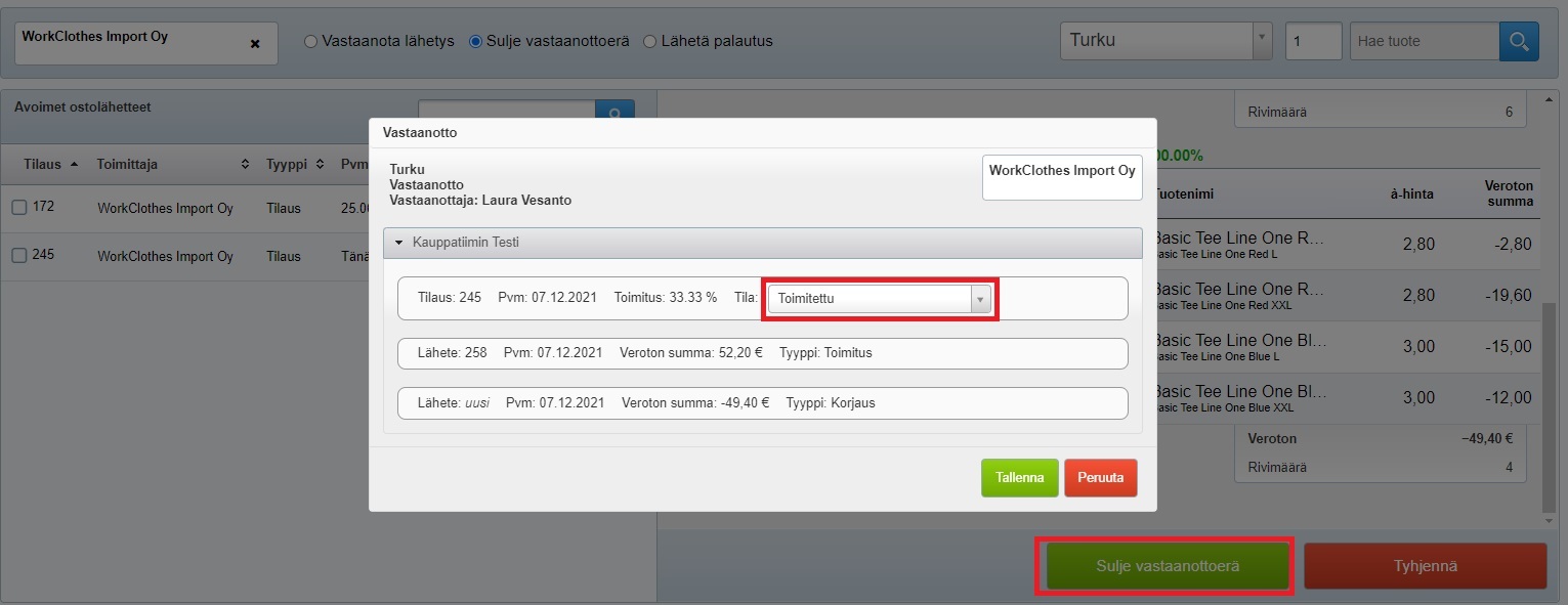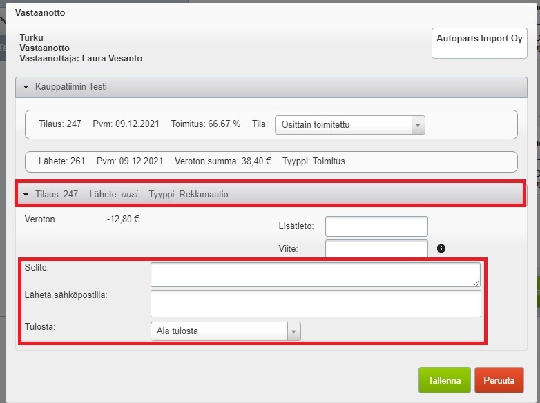 - Kun klikkaat Sulje vastaanottoerä -painiketta, pääset lähettämään näistä reklamaation toimittajalle:
