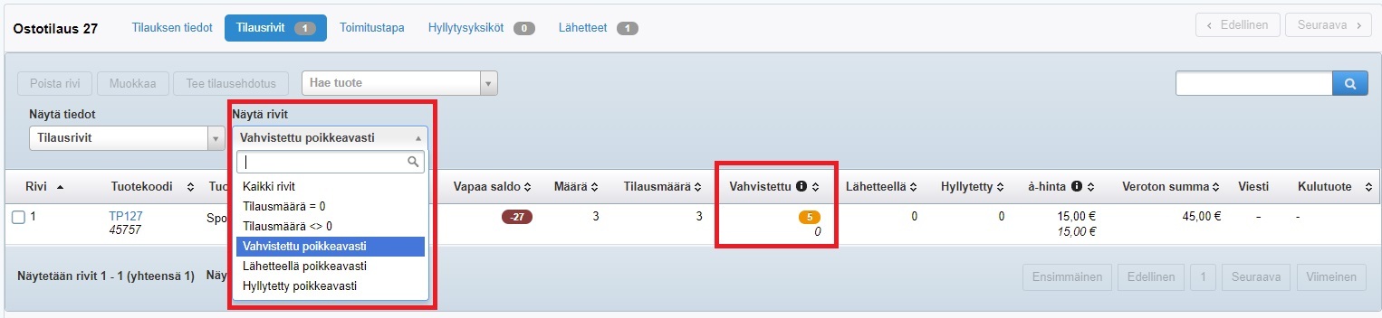 Tarkemmalle tasolle pääset, kun klikkaat kyseisen ostotilauksen auki ja siirryt sen Tilausrivit-välilehdelle. Näytä rivit -suodattimella voit suodattaa näkymään vain ne rivit, jotka on vahvistettu poikkeavasti, joiden lähetteessä on ollut eroja tilaukseen verrattuna tai joiden hyllytys on eronnut vastaanotetusta määrästä: