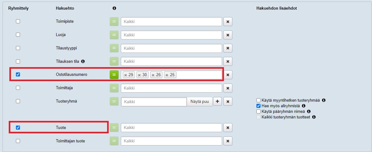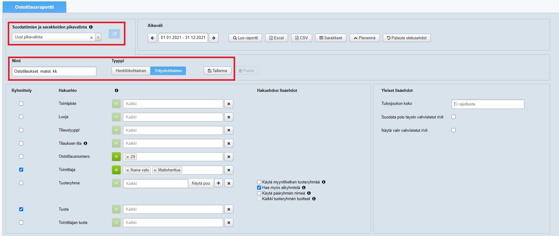- Voit suodattaa raportille mukaan vain esimerkiksi tietyn toimipisteen ostotilaukset tai tietyn henkilön tekemät ostotilaukset.