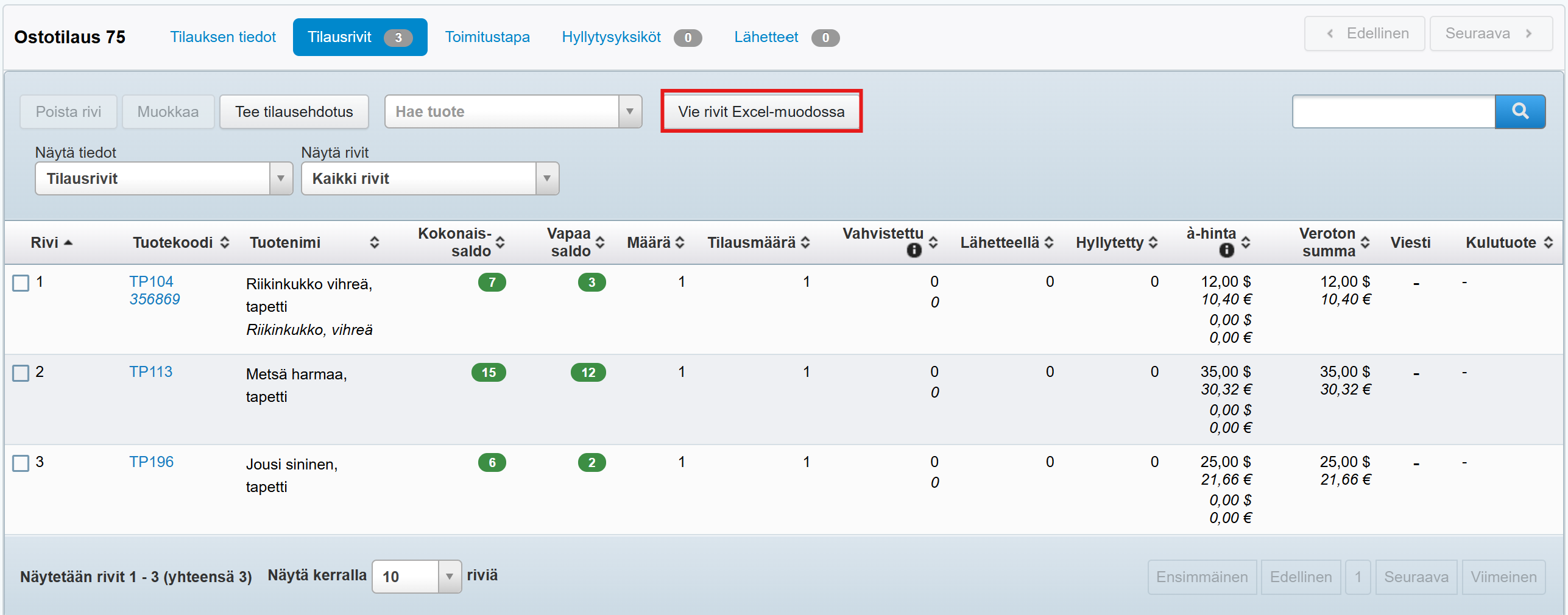 Jos tilaus toimittajalle tulee tehdä toimittajan omassa järjestelmässä ja toimittaja vaatii Excel-tiedostoa, voit tallentaa Tehdeniin luodun ostotilauksen rivit Excel-muodossa: