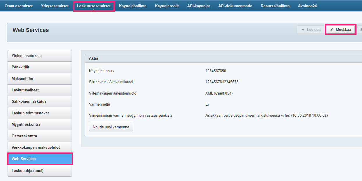 Jos yritykselläsi on käytössä WebServices-sopimus, joka noutaa viitemaksujen tiedot pankilta Tehdeniin, siirry tämän jälkeen seuraavaan kohtaan.